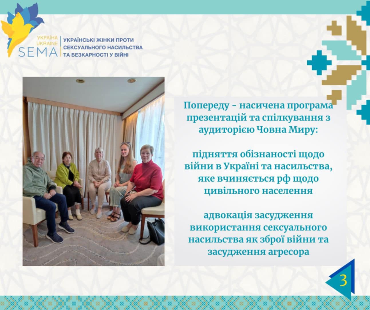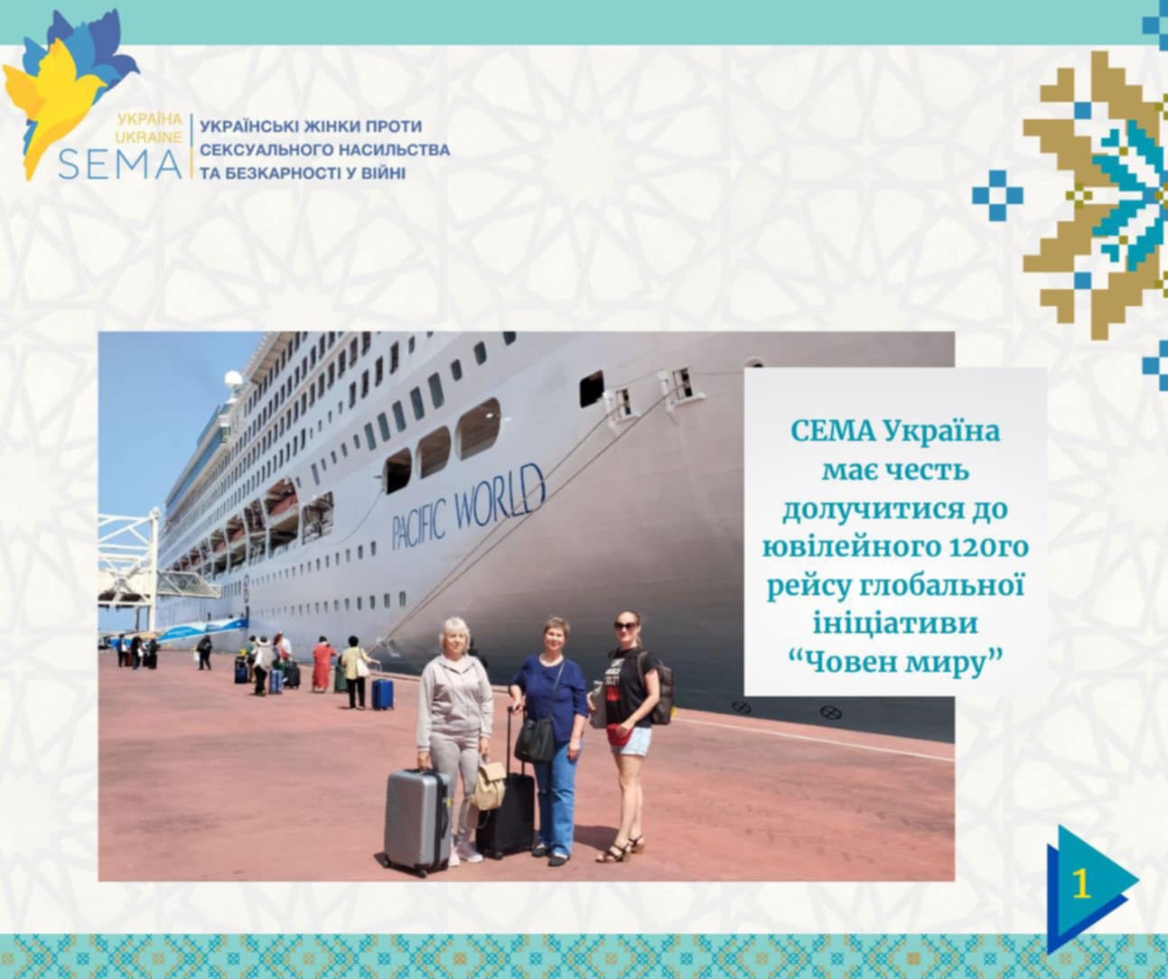 Глобальна ініціатива "Човен миру" втілює ідеї Цілей сталого розвитку ООН. Вона створює простір для міжкультурного діалогу, проведення презентацій та практичного навчання. Українські представниці громадської організації Sema Ukraine отримали можливість донести інформацію японській, китайській і корейській аудиторії про війну в Україні, підняти рівень міжнародної адвокації щодо засудження російської агресії та її численних воєнних злочинів, серед яких і використання сексуального насильства як зброї війни.