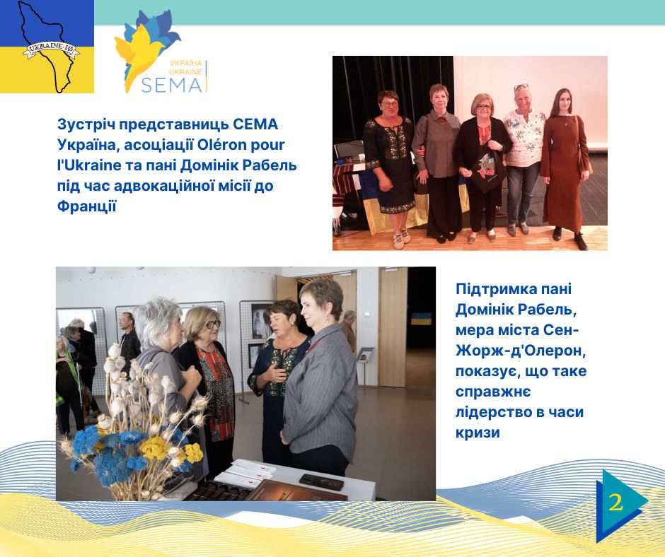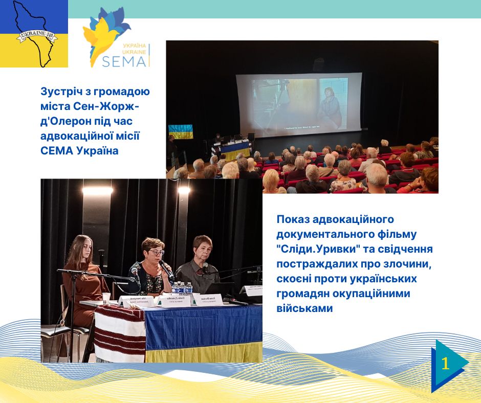 На важливій конференції ми: - презентували коротку адаптовану версію документального фільму "Сліди. Уривки", створеного режисеркою Алісою Коваленко за підтримки Фонду Муквеге, - почули свідчення членкінь СЕМА Україна — Ірини Довгань і Дар’ї Зименко — про злочини окупаційних військ щодо українського населення, - отримали глибоко емоційний відгук від аудиторії під час сесії запитань і відповідей. Особливо вражало тепло та солідарність місцевої громади. Нас ушанувала своєю присутністю пані Домінік Рабель, мер Сен-Жорж-д'Олерона, яка від початку повномасштабного вторгнення активно підтримує українських внутрішньо переміщених осіб у своїй громаді. Її відданість є надихаючим прикладом справжнього лідерства в часи кризи. Конференція також була місцем, де представили фотовиставку Дар’ї Зименко — історію її відновлення та зростання після травматичного досвіду.