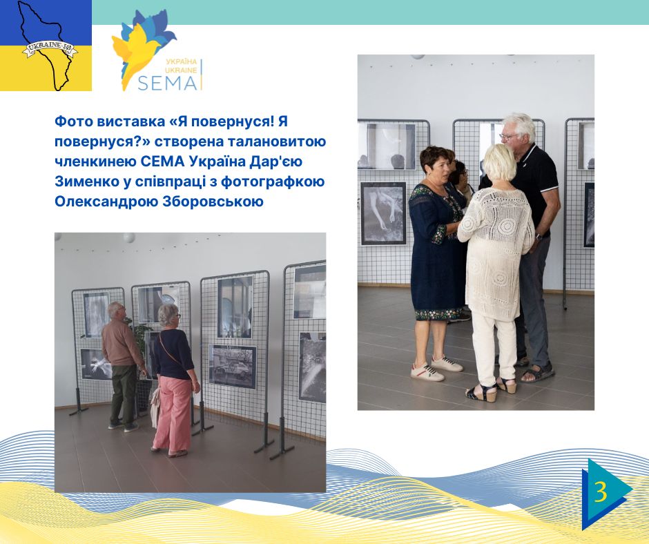 «Я повернуся! Я повернуся?» — питання, що проникло у глибини душі й стало назвою одного з найвагоміших творчих проектів SEMA Ukraine. Ідея належить талановитій Дар’ї Зименко, яка спільно з фотографкою Олександрою Зборовською створила виставку, що виходить за рамки стандартного мистецтва. Це не просто візуальні образи, а правдиве і пронизливе свідчення про біль, травматичний досвід та вражаючу силу стійкості. Слова Дар’ї влучно переплітаються з глибокими фотозображеннями Олександри, щоб яскраво підкреслити реалії людей, які пройшли крізь важкі випробування. Цей проект не лише розкриває їхні травми — він акцентує увагу на тому, що постраждалі є живими особистостями зі значущими історіями, які заслуговують бути почутими. Виставка стала яскравою подією в культурному житті та була представлена в Палаці конгресів міста Рошфор .