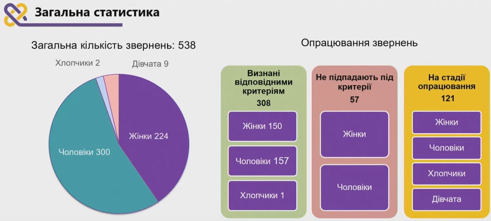 Ольга Опаленко, представниця ГО Truth Hounds та голова технічного секретаріату проекту, роль якого полягає в ретельній перевірці усіх наданих заявницею, або заявником документів, сопоставленням фактів, які було знайдено технічним секретаріатом. . Вона повідомила про розподіл виплат: 150 жінкам, 157 чоловікам і одному неповнолітньому хлопцю. Вона зазначила, що перебувають на стадії опрацювання 173 звернення, а частина буде переглянута апеляційним комітетом через виявлені розбіжності у свідченнях. Найбільше заявок надійшло з Херсону та області, Донецька і області, Київщини, Харківщини Запоріжжя і області, Сумщини, Чернигівщини та інших регіонів, 2 звернення є з території рф . Зібрані дані враховують звернення до і після початку повномасштабного вторгнення, що дозволяє скласти загальну картину ситуації.