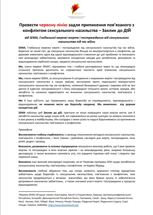 Цей посібник був створений у межах глобальної місії ініціативи «Червона Лінія», яку впроваджує Фонд Доктора Деніса Муквеге. Вона спрямована на викорінення сексуального насильства, пов’язаного з конфліктами.