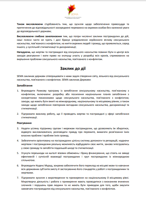 Олена Лазарєва, представниця ГО «СЕМА Україна», розповіла про вклад нашої організації у боротьбу із сексуальним насильством пов’язаним з конфліктом. Вона зазначила, що членкині організації активно співпрацюють з урядом, беруть участь у створенні законодавчих ініціатив та налагоджують співпрацю з міжнародними партнерами.Олена наголосила, що існує обмін найкращими практиками у цій сфері з метою викорінення СНПК.