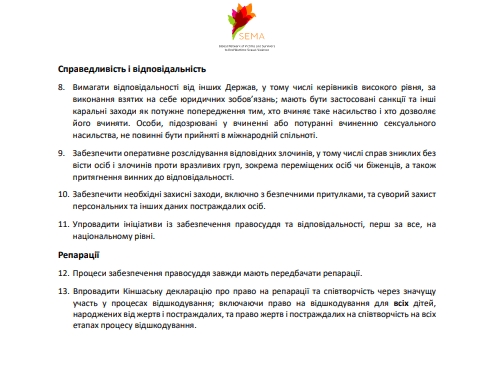Учасники підкреслили важливість підвищення обізнаності держав, політиків, громадянського суспільства та груп людей, які вижили, щодо існуючих правових зобов'язань, висвітлили найкращі практики залучення постраждалих від СНПК що їх голос направляє зусилля щодо припинення такого насильства.