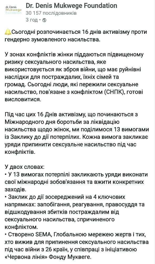 Про це розповіла Ерін Розенберг, старша радниця з правових та політичних питань Фонду доктора Деніса Муквеге.
