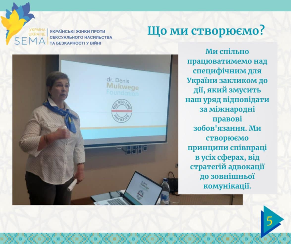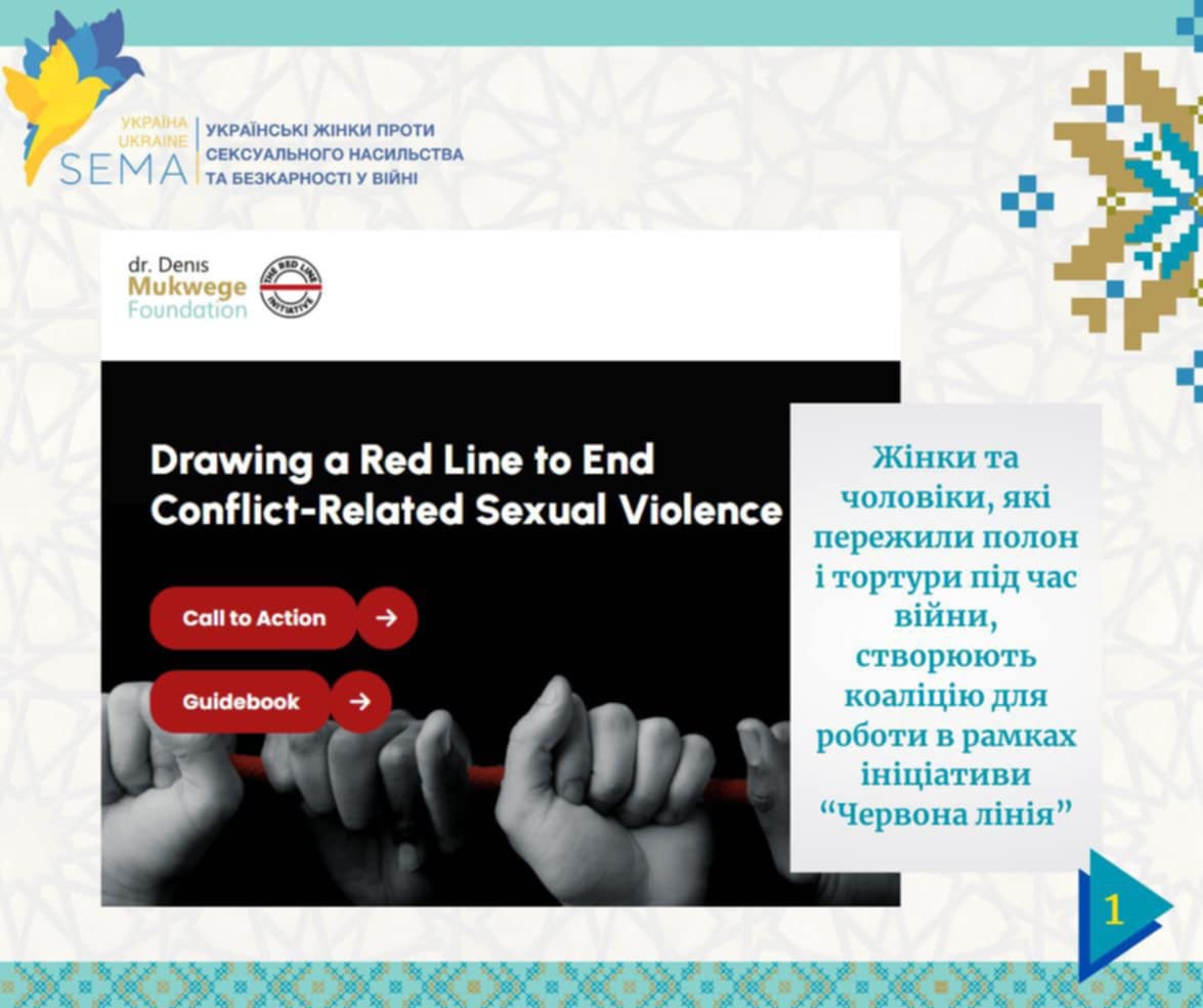 Наприкінці травня в Києві відбулася значуща подія. Активісти чотирьох громадських організацій, створених постраждалими — SEMA Ukraine, ALUMNI, 29 грудня та Numo Sisters — об'єдналися на унікальному семінарі. Захід проводився за підтримки Mukwege Foundation Фонду Доктора Деніса Муквеге і був присвячений ініціативі «Червона лінія», спрямованій на досягнення справедливості та підтримку переживших.