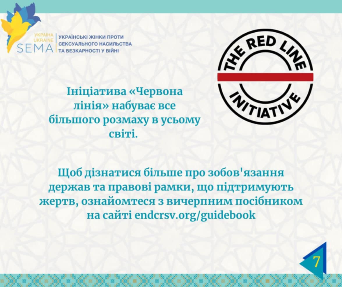 Ініціатива «Червона лінія» набуває все більшого розмаху в усьому світі. Щоб дізнатися більше про зобов'язання держав та правові рамки, що підтримують жертв, ознайомтеся з вичерпним посібником на сайті http://endcrsv.org/guidebook