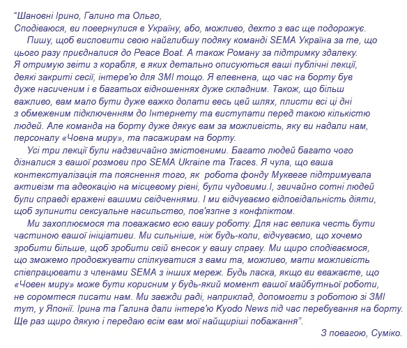 Читайте про ЧОВЕН МИРУ: https://peaceboat.org/english/news/media-briefing-time-for-peace